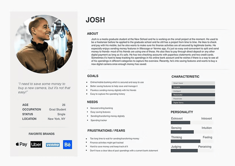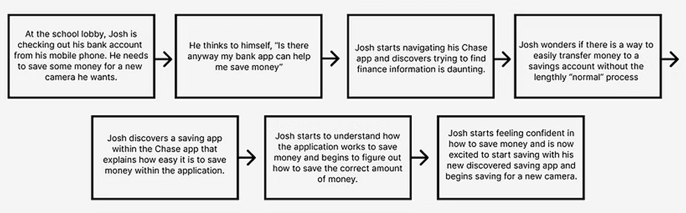 Based on the research findings and reflecting Chase’s target demographic, I created a persona for Josh to represent the findings from the research. Josh is a young student of the Millennial generation who needs help on saving. By giving context and personality to the research data, we can synchronize their behaviors and better emphasize with the target user throughout the design process. To accomplish Chase’s scope of new features on mobile devices, I primarily focused on millennial users.