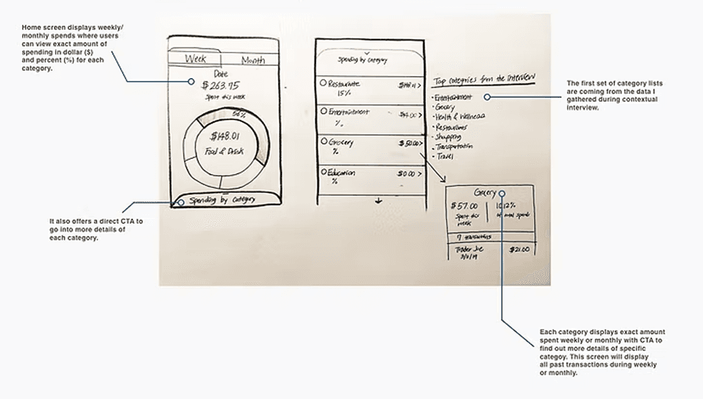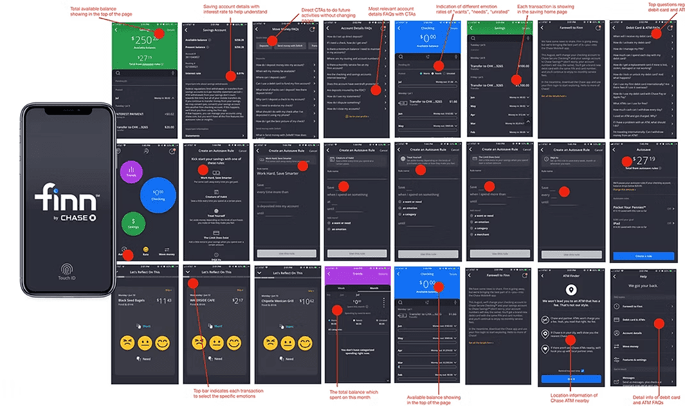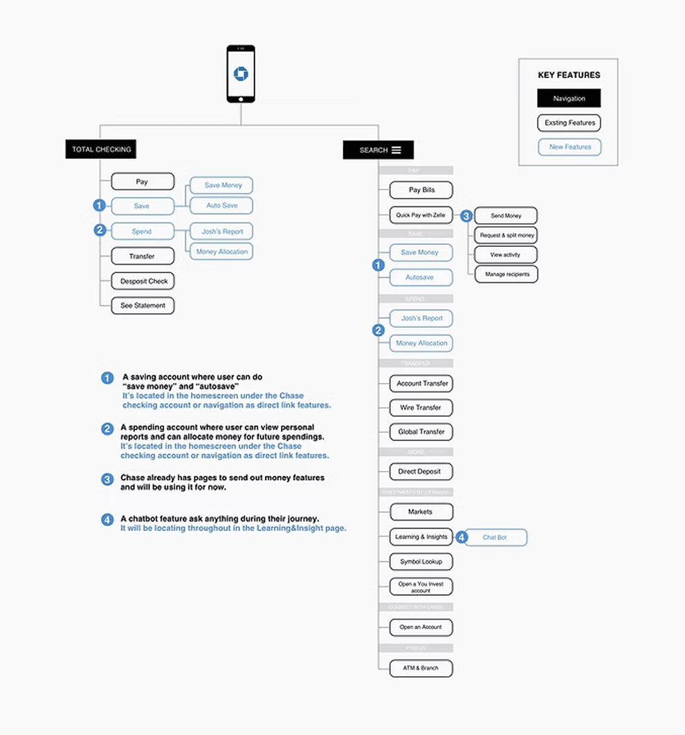 Before creating wireframes, I studied Chase's mobile app to become familiar with its current design. I took notes on the main features and also looked into the latest features of other top apps for Millennials. Finn's thorough research and user testing had already led to the development of suitable features for Millennials. I aimed to leverage these features to my advantage. This process helped me better grasp Chase's design style and also learn from Finn's advanced features. I identified opportunities to enhance new features and explored how to integrate them effectively.