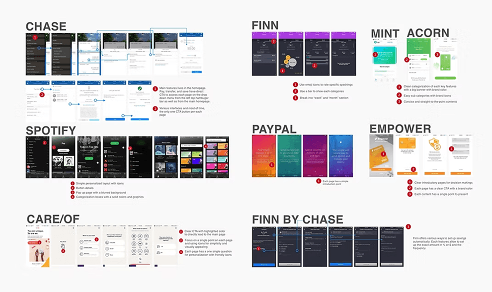 After common goals, I researched features from major competitors based on Josh’s and Emma’s needs. These analysis led me to correlate best features from the top finance management companies for Chase users. These analysis opened a design question to explore: