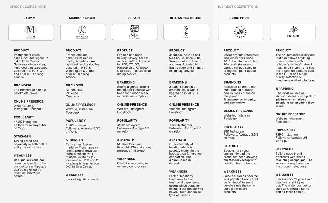 Given the intense level of competition in the market, a comprehensive assessment of Harbs' standing relative to its rivals emerged as a pivotal task. Consequently, I meticulously pinpointed both direct and indirect contenders, entities catering to a similar clientele as Harbs, and proceeded to dissect their online profiles and information. This analytical juxtaposition furnished invaluable insights into customer expectations, enabling a nuanced comprehension of how Harbs could strategically position itself vis-à-vis these formidable competitors.