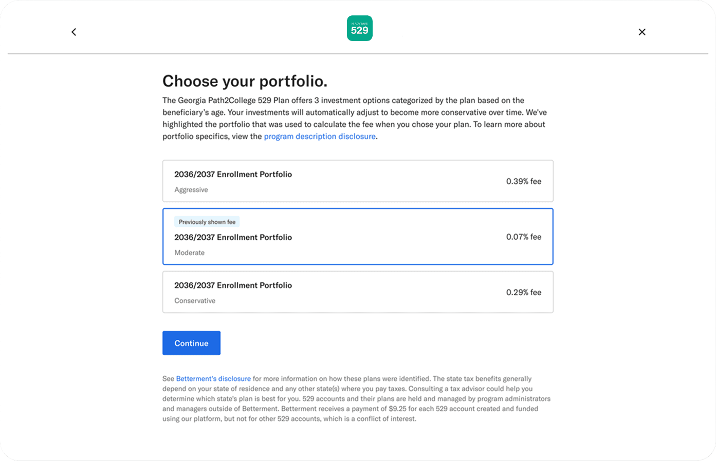 Here, the “easy” investment experience only shows portfolios that match a users target-date. Some 529s only have 1 portfolio per target date, while others have multiple with varying levels of risk. Preselected would always be the portfolio used earlier when comparing 529 plans so that a user could simply hit continue on this page.