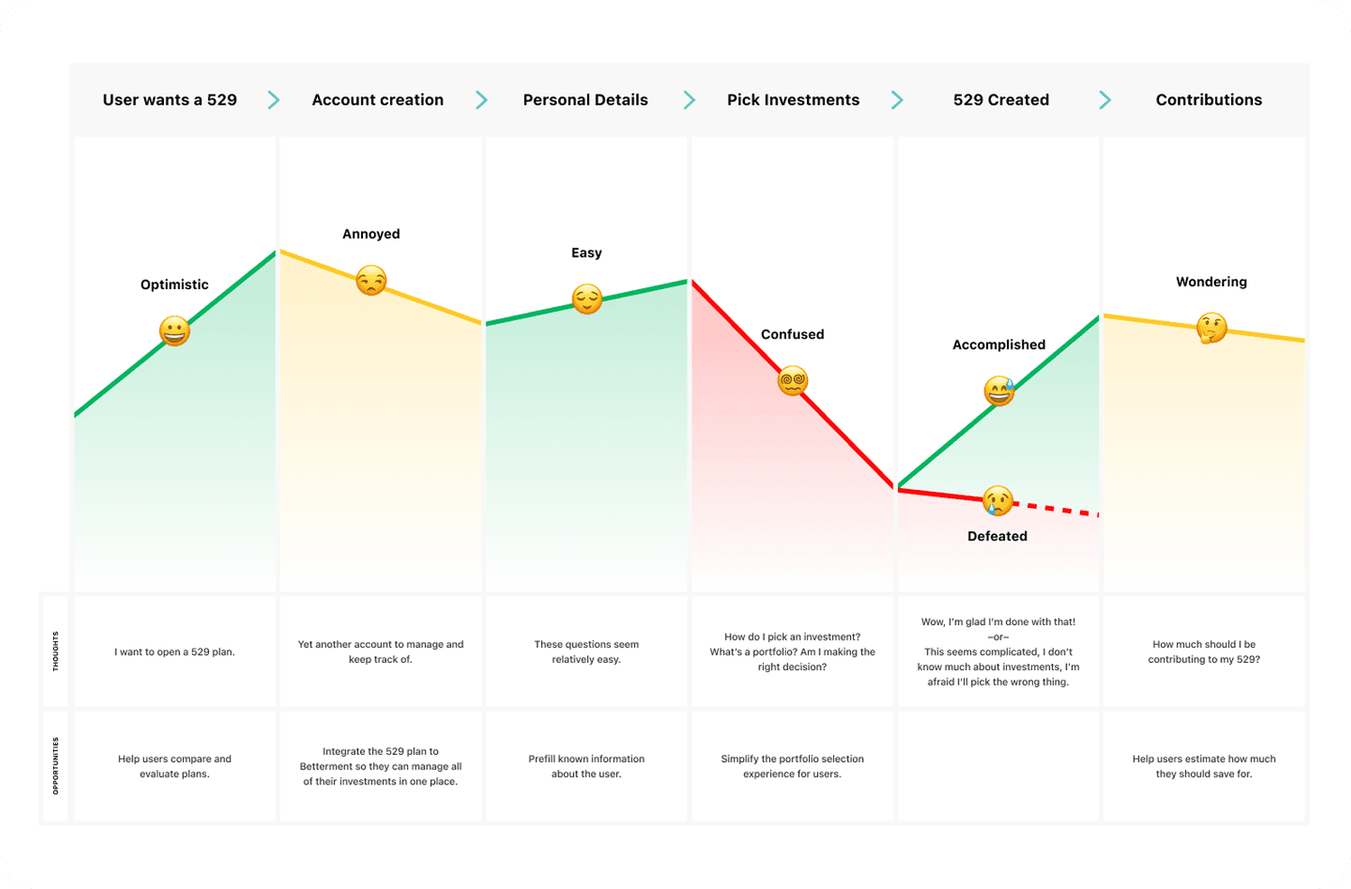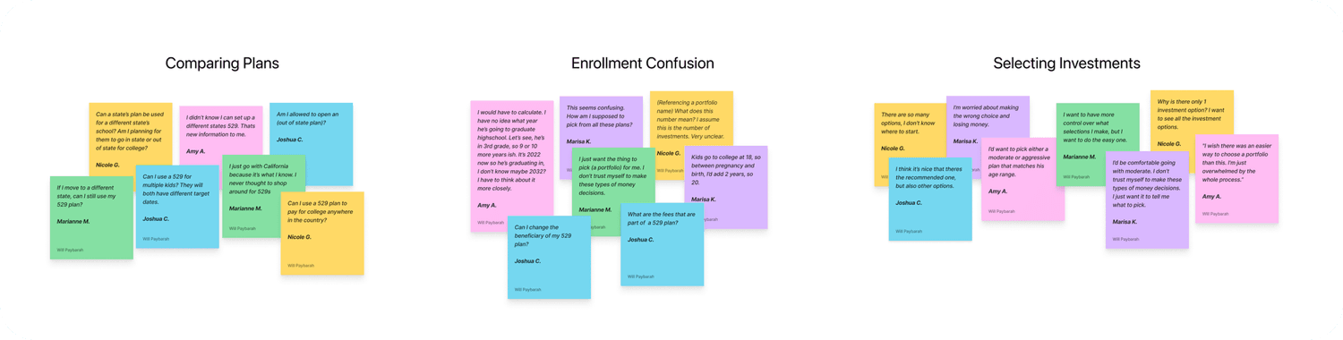 After interviewing the participants and synthesizing their feedback, I created a customer journey map to better identify pain-points in the 529 enrollment experience, and opportunities to improve upon. This helped visualize the enrollment experience for the broader team, allowing stakeholders to align on improvement opportunities.