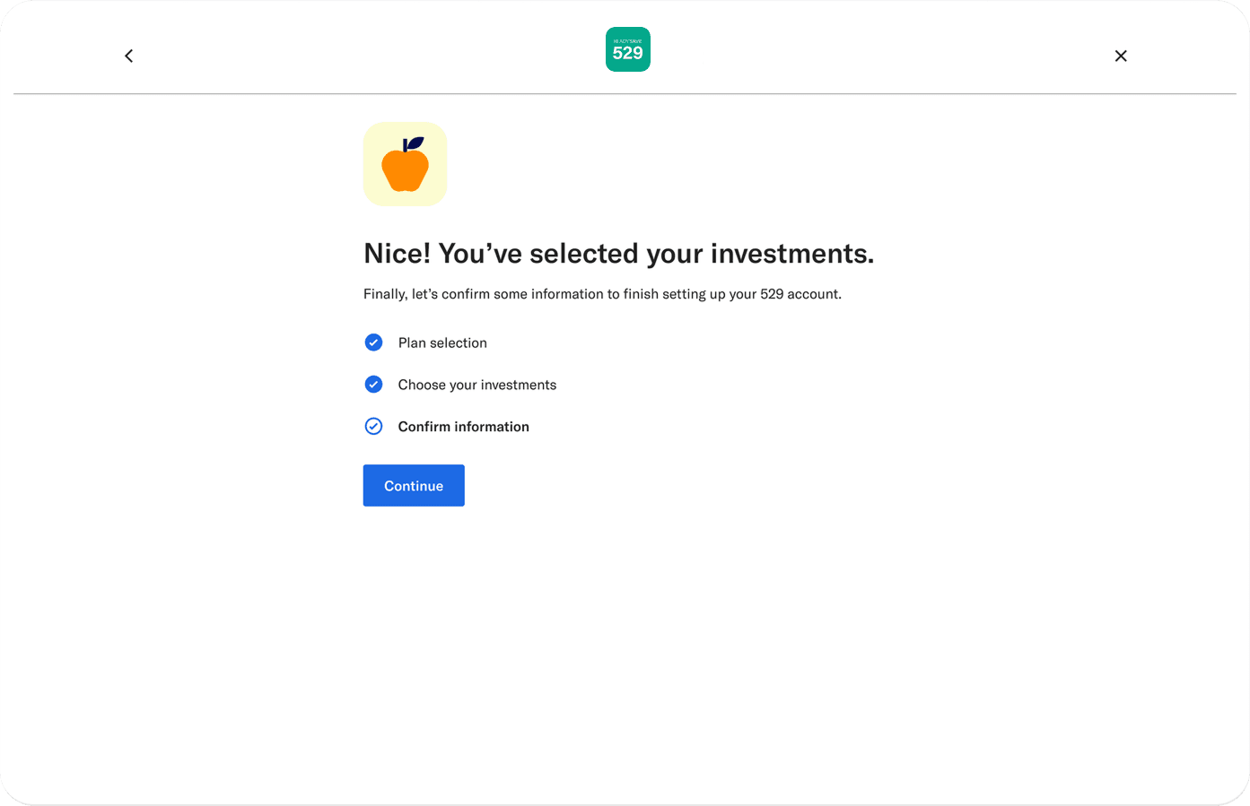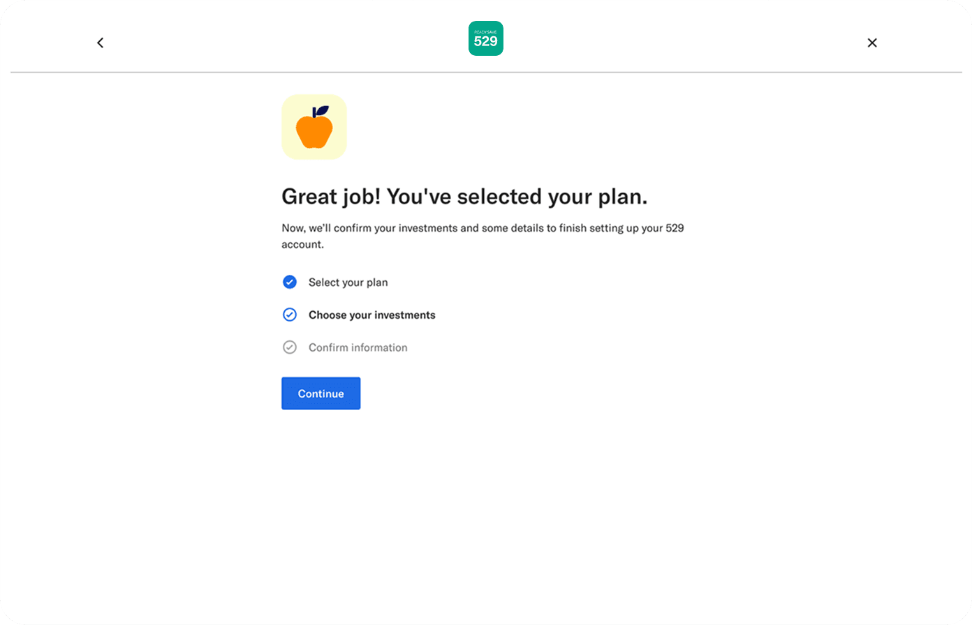 After confirming all their information, set up is complete! By this stage a user will have selected a 529 plan, selected their investment strategy, and submitted information about the beneficiary. The only step left is for the user to start saving!
