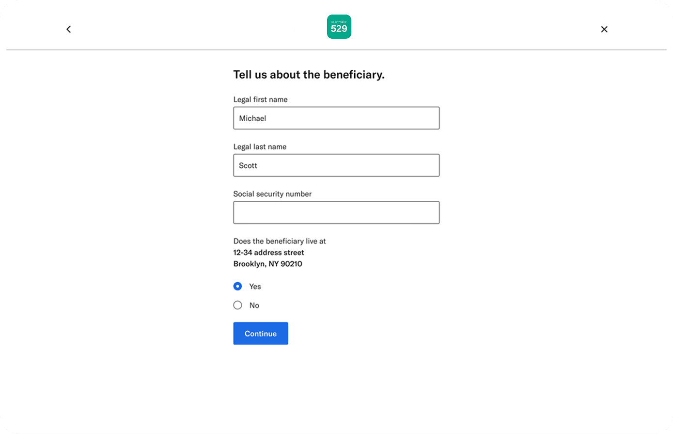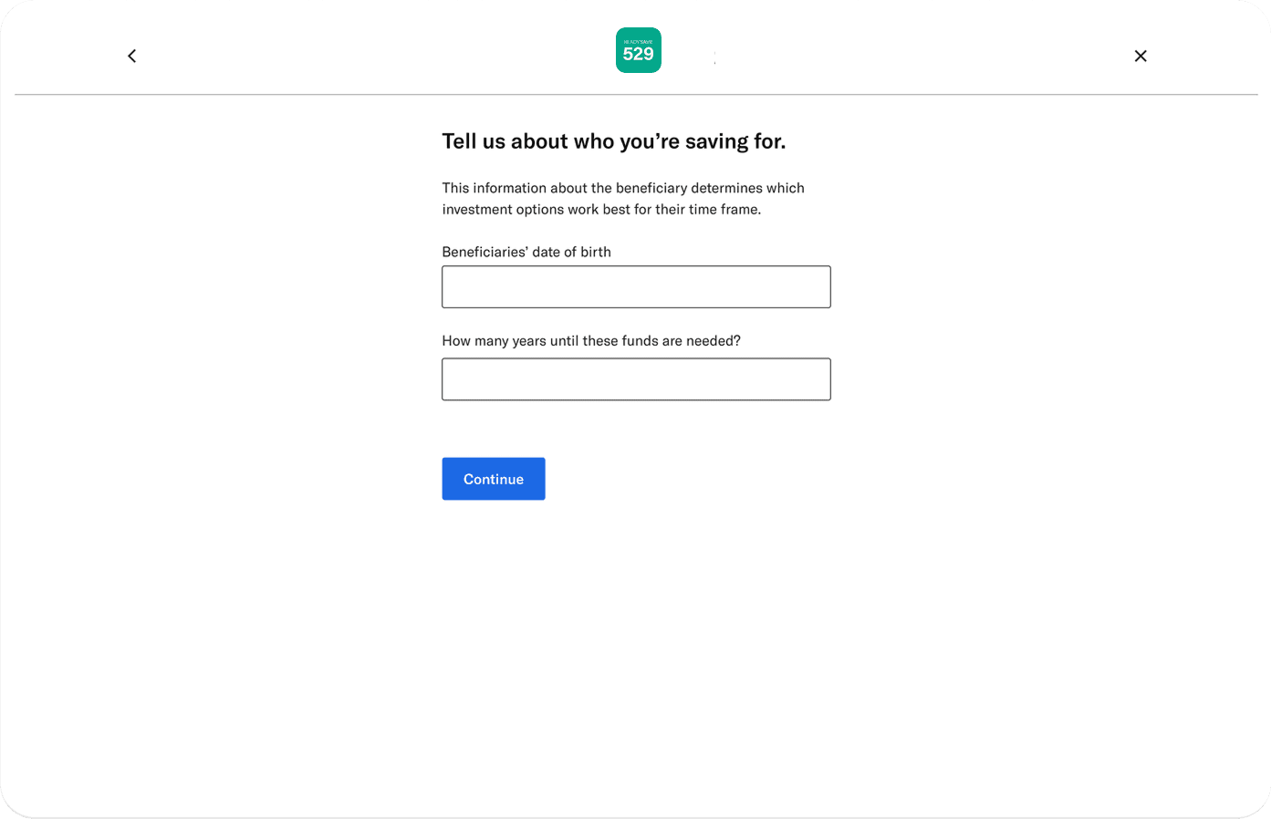 To make the sign up process as easy as possible for users, two questions are asked: the beneficiary's date of birth and how many years until funds are needed. This information helps show them 529 plans and investment options that are most likely to meet their needs.