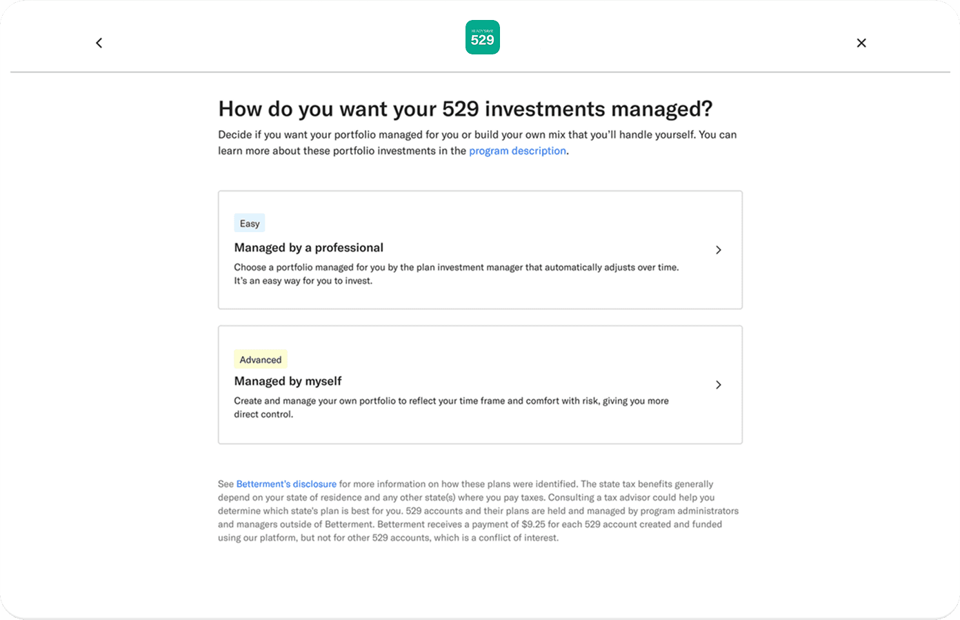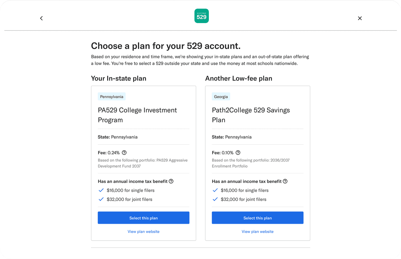 Here, the user is given a choice of 529 plans. This page varies depending on what state the user lives in, whether or not that state offers tax-benefits, and how high the fees are, and other criteria. In whatever situation the user is in, they’ll always be presented with clear information to make an educated 529 selection, with additional resources should the user want to learn more.