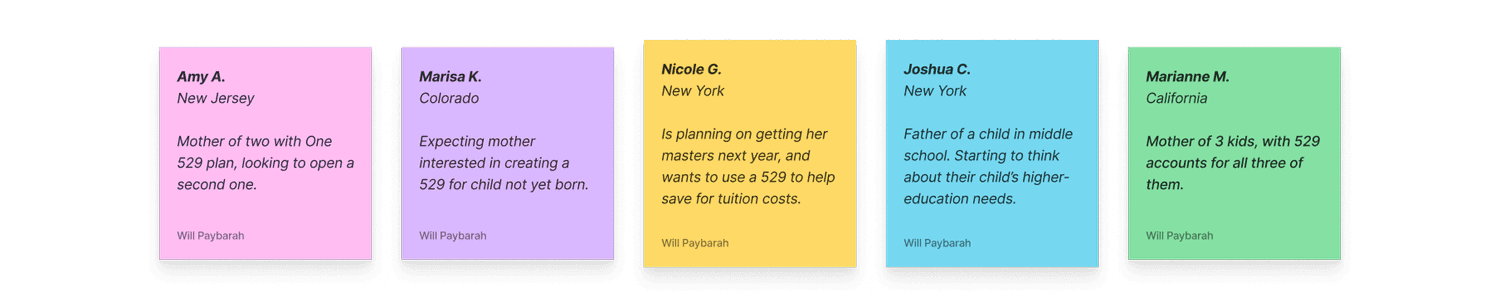 I recruited five research participants via usertesting.com who said they were interested in opening a new 529 plan. I conducted qualitative interviews with them to gain a deeper understanding of their experience of trying to open a new 529 plan. I prototyped a fake 529 plan for them to enroll in, allowing me to observe their pain points and get feedback on how the enrollment process could be improved.